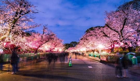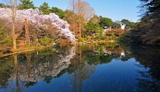 位於青森縣西南部、津輕平原的南部,保存著“天守閣”的弘前城遺跡,約380年築城歷史,尚保留天守閣、櫓、城門、護城河等築城形態全貌,是日本非常罕見而珍貴的城堡遺蹟。由三重護城河和土圍起來的弘前公園對外開放,佔地約49.2公頃,染井吉野櫻為主的櫻花林50餘種2,600株櫻花同時盛開,繽紛柔美的景緻,令人驚艷,春天花見時弘前櫻花季落英繽紛,站在朱紅拱橋遠方,以橋為背景、弘前城為遠景,橋與城掩映在櫻花群中,色彩分明,構成一幅極美的畫面。尤其當櫻花隨風飄落飛舞時,「花吹雪」景象另人終生難忘,是東北的一大盛事。是著名的賞櫻百選名所。