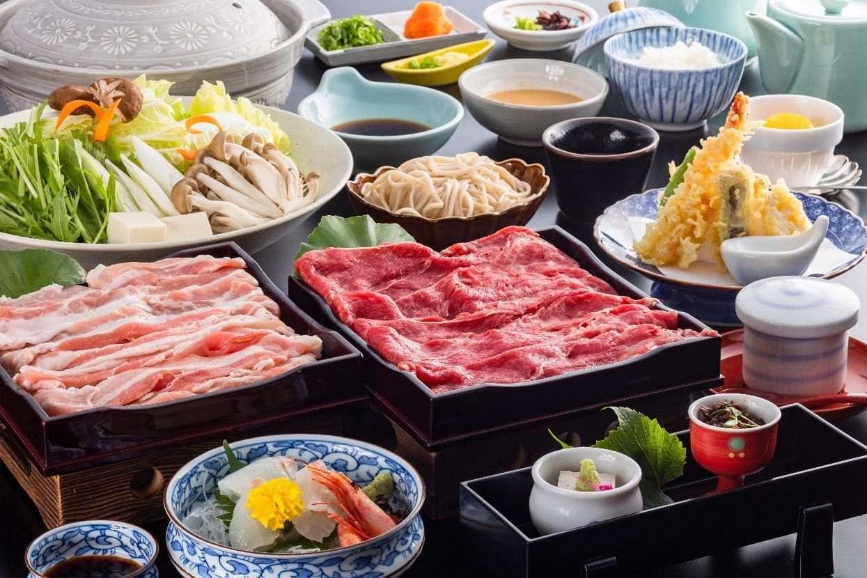 內容:特色前菜,生魚片三種組合、茶碗蒸、炸天婦羅組合、牛肉 & 豬肉涮涮鍋(牛肉 & 豬肉各約60克)、白飯、醬菜、紅味噌湯、甜點。